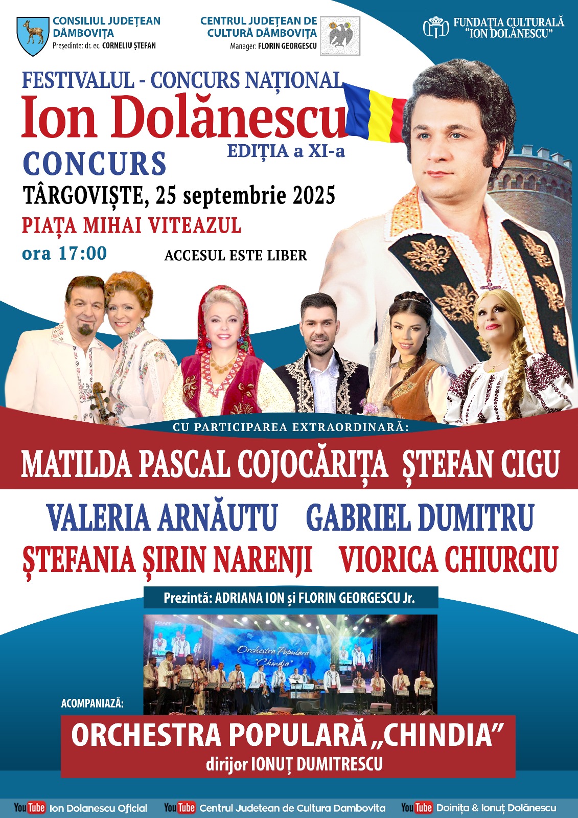Consiliul Judeţean Dâmboviţa, prin Centrul Judeţean de Cultură Dâmboviţa, alături de Fundaţia Culturală „Ion Dolănescu”, vă invită în zilele de 25 și 26 septembrie 2025 la un eveniment cultural de marcă, un regal al cântecului popular românesc: Festivalul–concurs naţional „Ion Dolănescu”, ediția a XI-a.