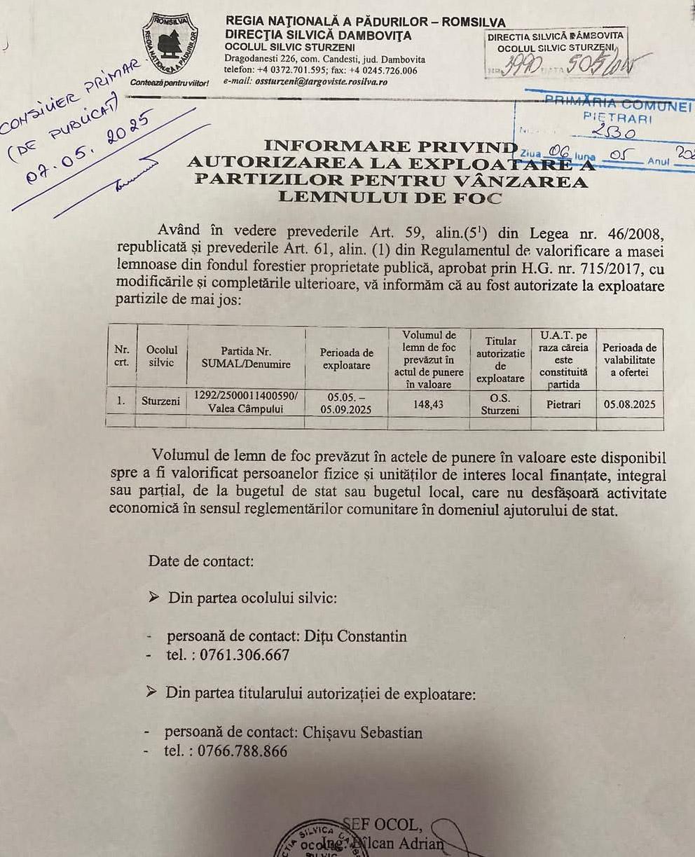 Primăria Pietrari îi informează pe locuitorii comunei că Ocolul Silvic Sturzeni a deschis în zona Valea Câmpului din localitate o partidă de exploatare masă lemnoasă pentru vânzare lemn de foc. Sunt disponibili, conform actului de punere în valoare, 148,43 metri cubi, iar perioada de exploatare se va încheia în data de 5 septembrie 2025.