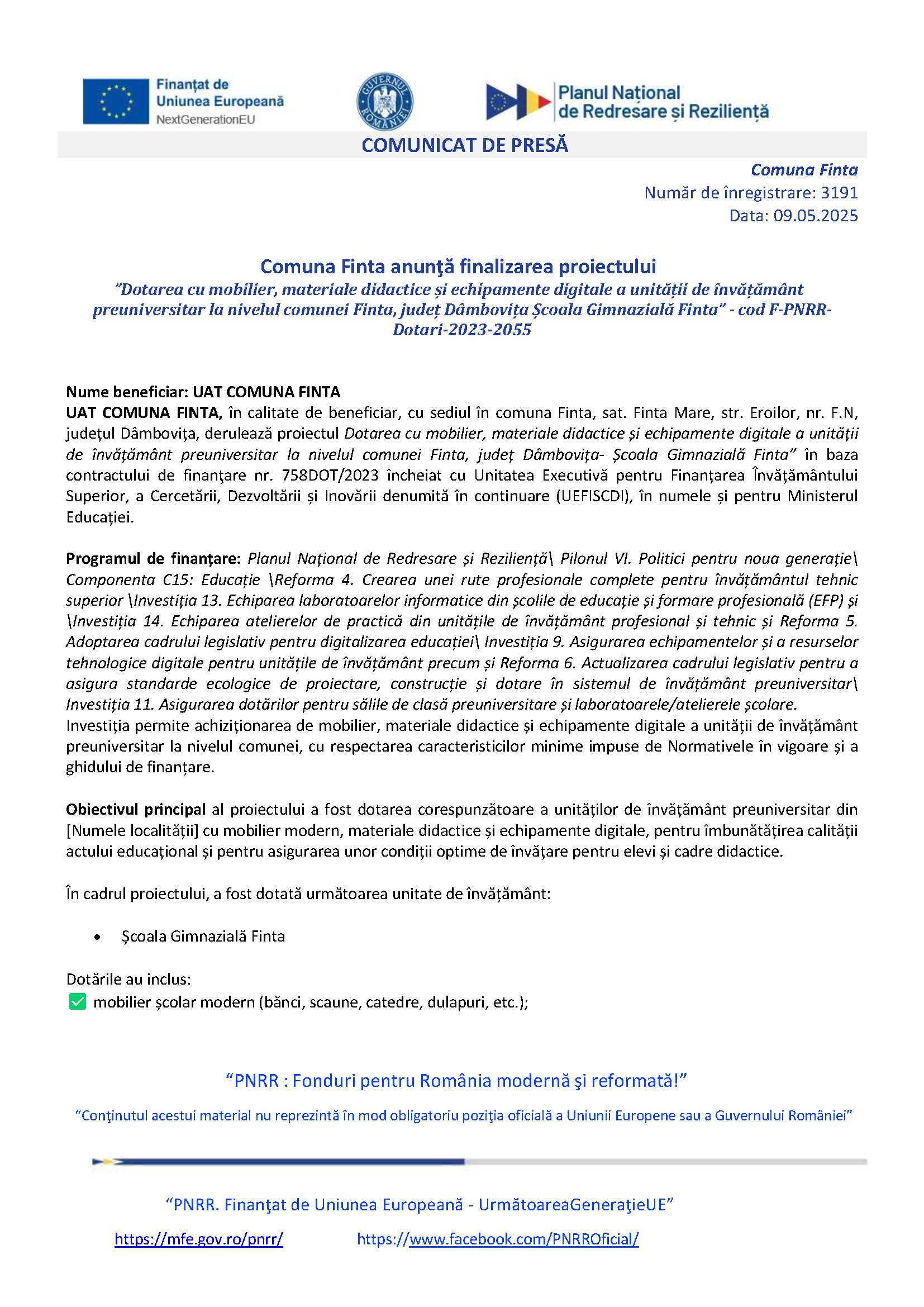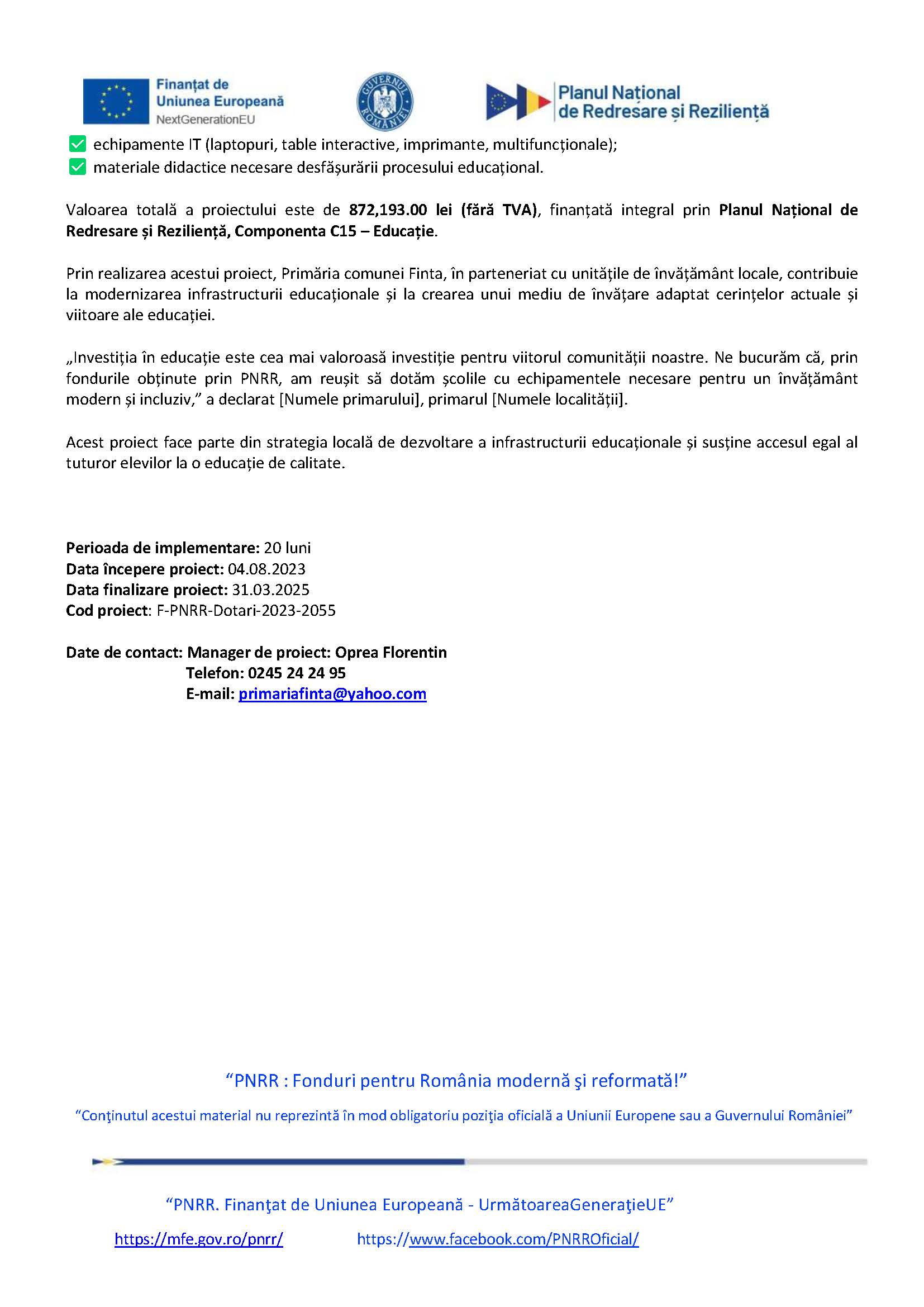 ”Dotarea cu mobilier, materiale didactice și echipamente digitale a unității de învățământ preuniversitar la nivelul comunei Finta, județ Dâmbovița Școala Gimnazială Finta” - cod F-PNRR-Dotari-2023-2055