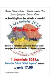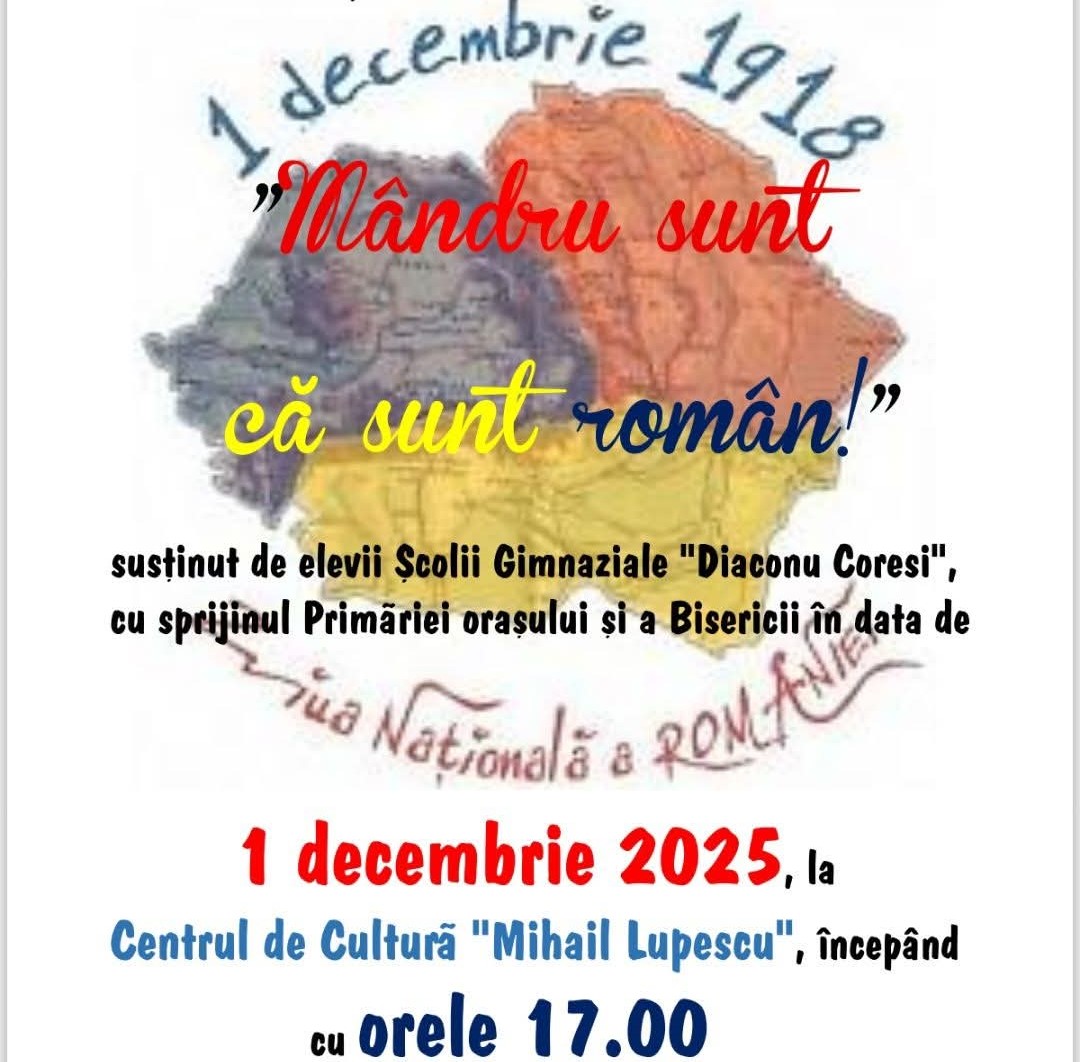 Concertul intitulat „Mândru că sunt român”, susținut de elevi ai Școlii Gimnaziale Diaconu Coresi, va avea loc la Centrul de Cultură Mihai Lupescu, începând cu ora 17:00.