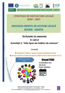 Echipa administrativă a GAL BUCEGI – LEAOTA și Primăria Fieni anunță continuarea ÎNTÂLNIRILOR de ANIMARE afererente trimestrului 1 – An 2 de implementare din cadrul Activității 2 “Alte tipuri de întâlniri de animare”. Evenimentul are loc în data de 24.11.2024, ora 9.30, la sediul Primăriei Orașului Fieni.