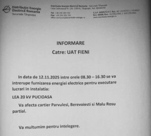 Miercuri, 12 noiembrie 2025, se întrerupe furnizarea energiei electrice între orele 08:30 și 16:30, pentru lucrări programate.