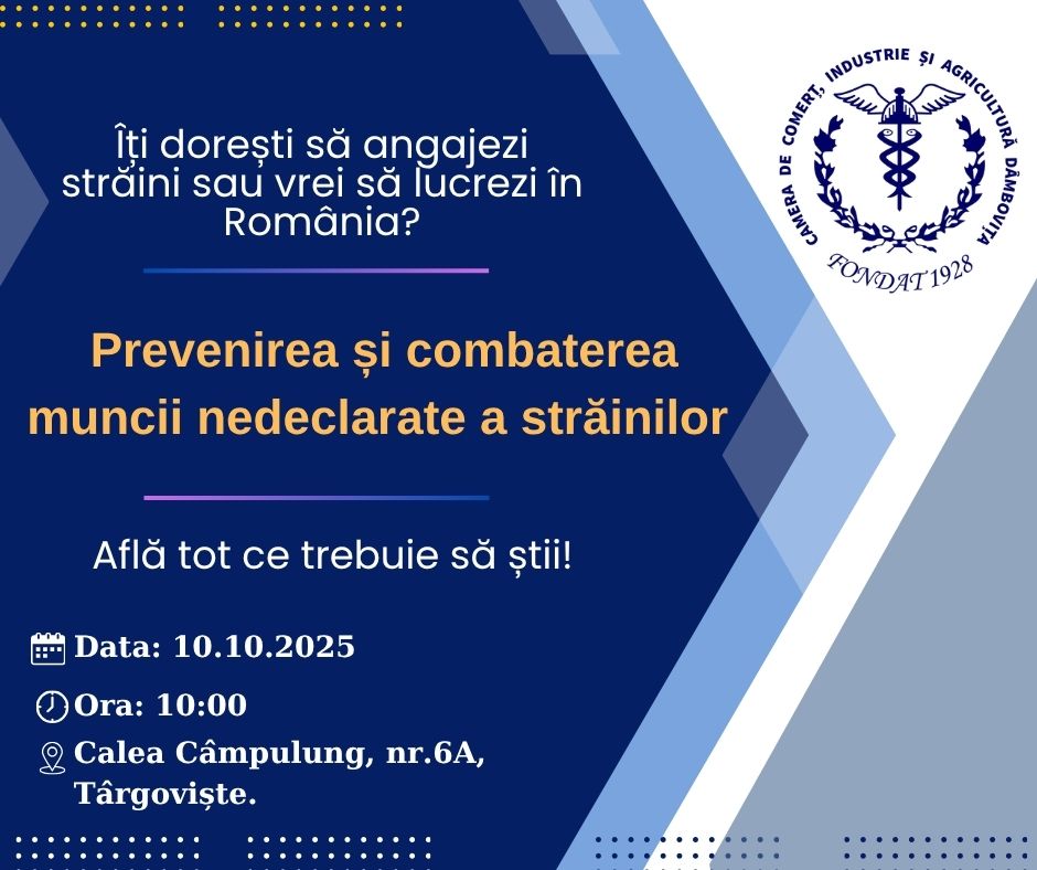 Camera de Comerț Industrie şi Agricultură Dâmboviţa împreună cu Biroul pentru Imigrări și Inspectoratul Teritorial de Muncă Dâmbovița, organizează o sesiune de informare cu tema: Prevenirea şi combaterea muncii nedeclarate a străinilor.